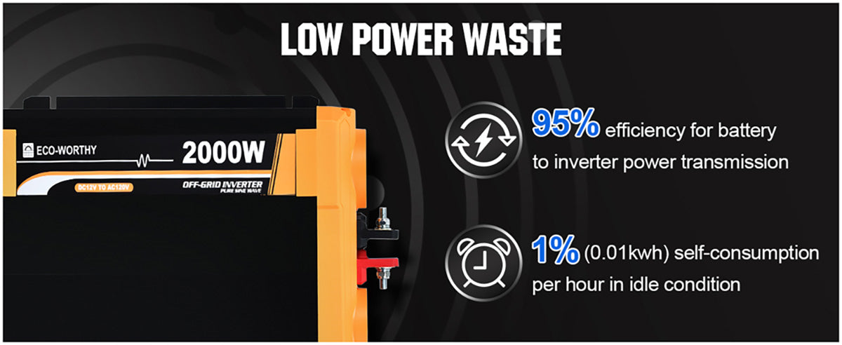 ECO-WORTHY 2000W Off Grid Pure Sine Wave Inverter 12V to 110V is a high-quality solar accessory that is perfect for off-grid systems, including cabins and tiny homes. A power inverter is an electrical device that transforms the DC power stored in batteries into standard household AC power for consumer electronic needs. As a pure sine wave inverter, it is capable of producing cleaner, smoother, quieter, and more reliable electricity to operate tools, fans, lights, and other electronics without interference.