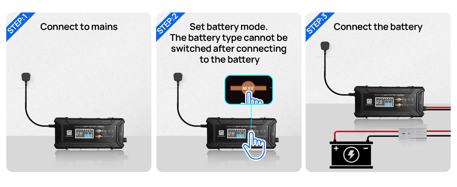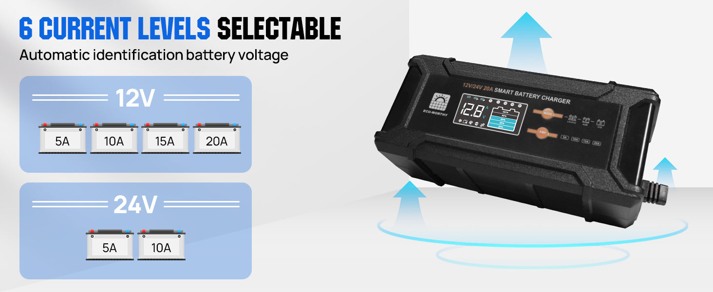 Intelligent voltage recognition: it can automatically recognize 12v/24v battery voltage, while allowing manual selection of charging current, charging current can be set according to the battery capacity, providing good support for different capacity batteries