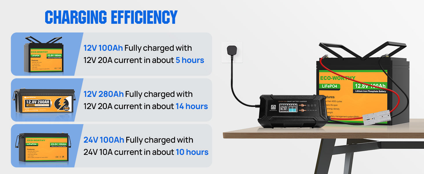 20A 12V/24V Smart Battery Charger with LCD Display for Most Batteries