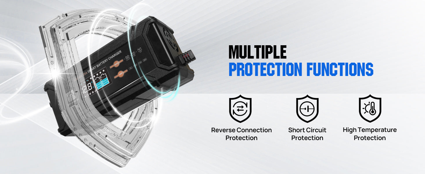 Comprehensive protection functions:such as reverse polarity, short circuit, and high-temperature battery,shell and wire V0 flame retardant grade material.
