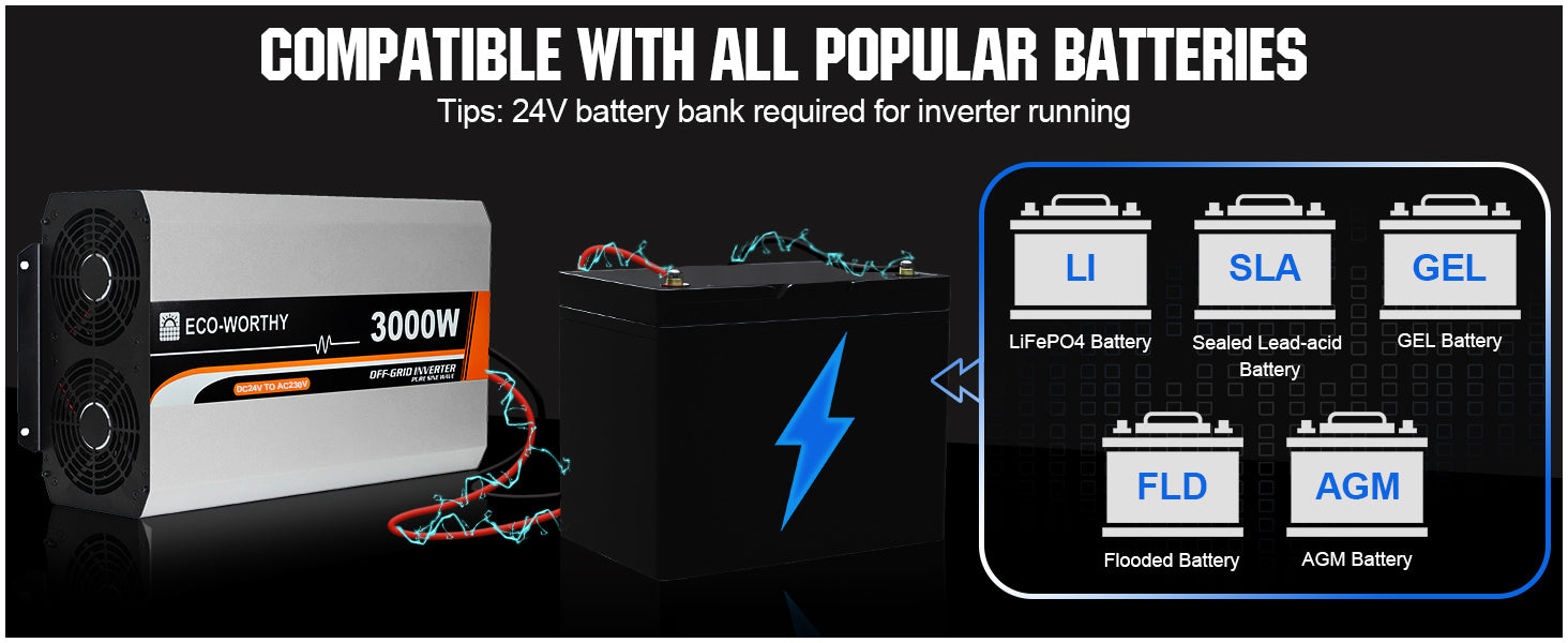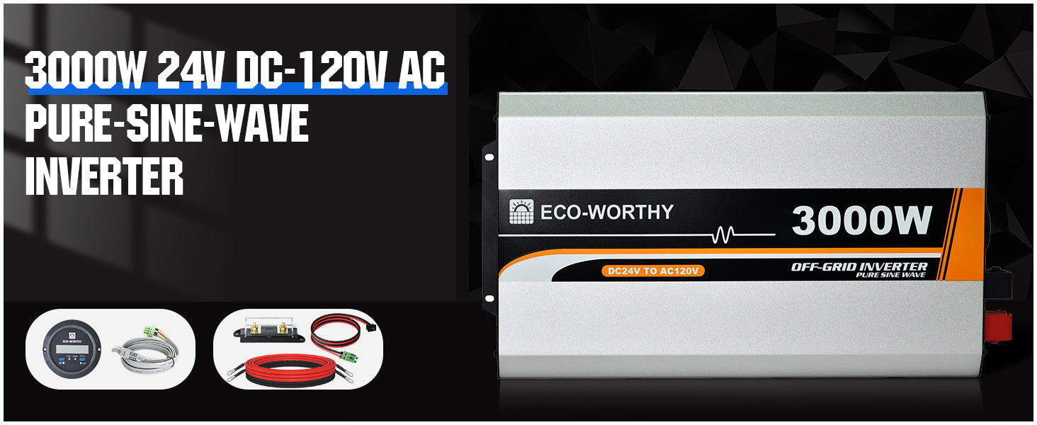 ECO-WORTHY 3000W Off Grid Pure Sine Wave Inverter 24V to 110V is a high-quality solar accessory that is perfect for off-grid systems, including cabins and tiny homes. A power inverter is an electrical device that transforms the DC power stored in batteries into standard household AC power for consumer electronic needs. As a pure sine wave inverter, it is capable of producing cleaner, smoother, quieter, and more reliable electricity to operate tools, fans, lights, and other electronics without interference.