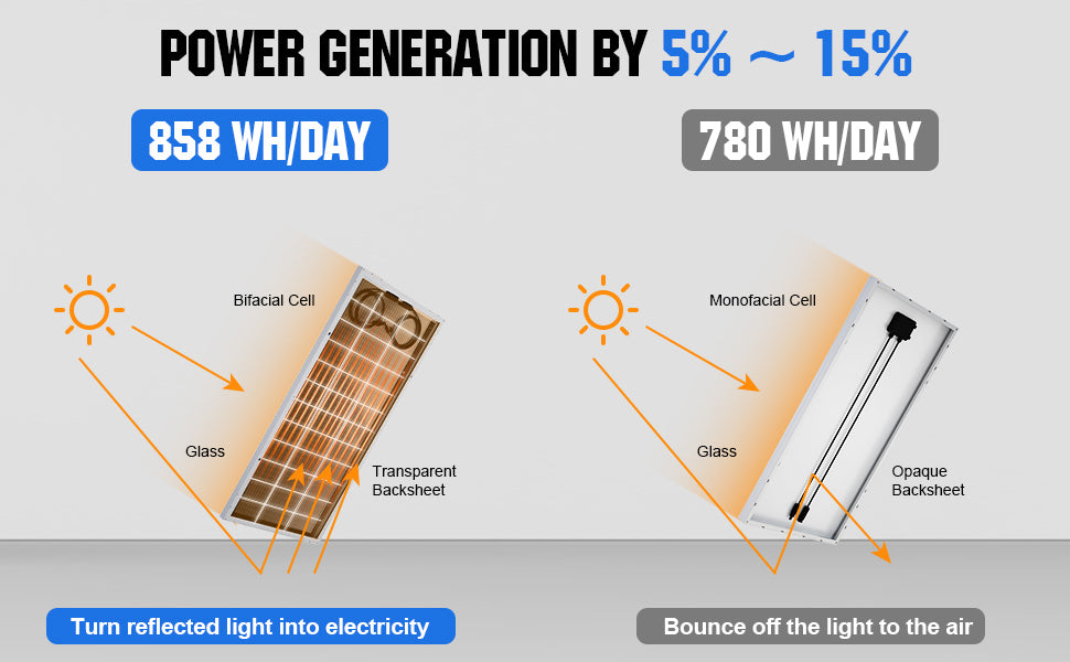 [Bifacial solar panels] Bifacial solar panels are designed with a transparent back of 12BB solar cells, the back panel uses composite materials, the light transmittance up to 91.5%, the conversion rate of 23%, the power generation is 858Wh per day under ideal conditions, compared to traditional solar panels, the power can up to 33%.
