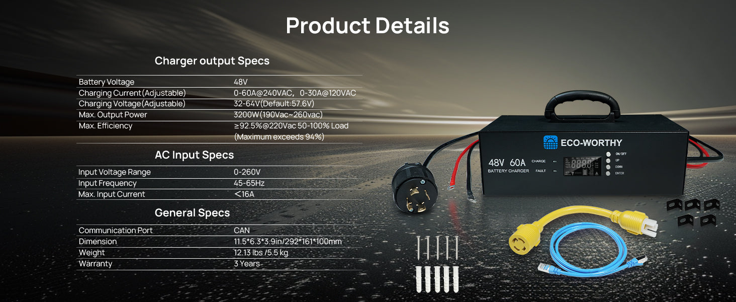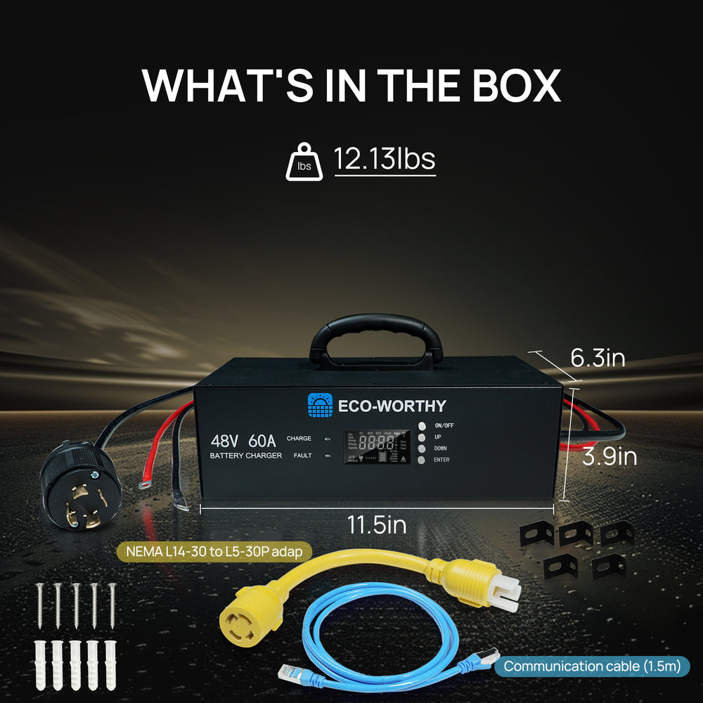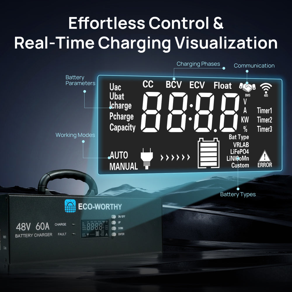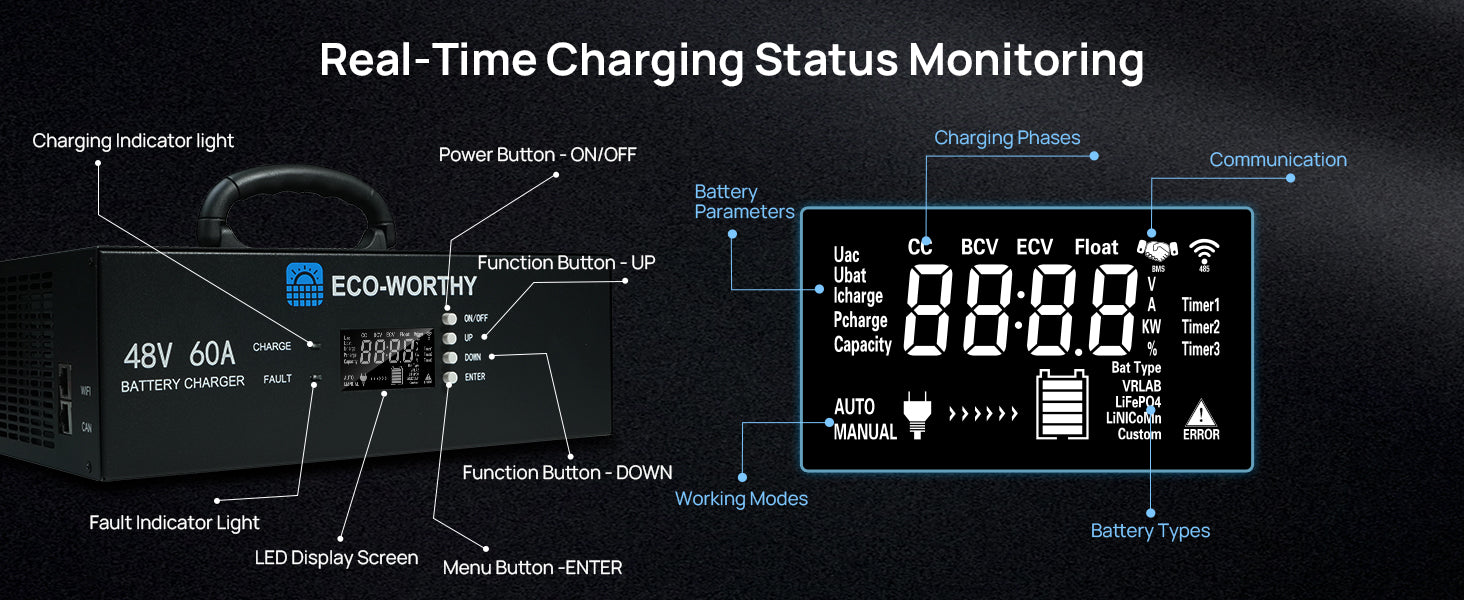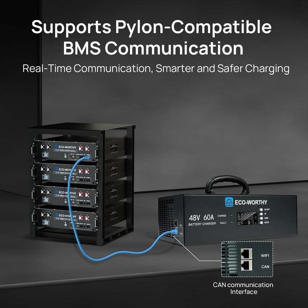 Smart Charging: The charger can communicate with the ECO-WORTHY 48V100AH battery via CAN, ensuring a safer and smarter charging process.