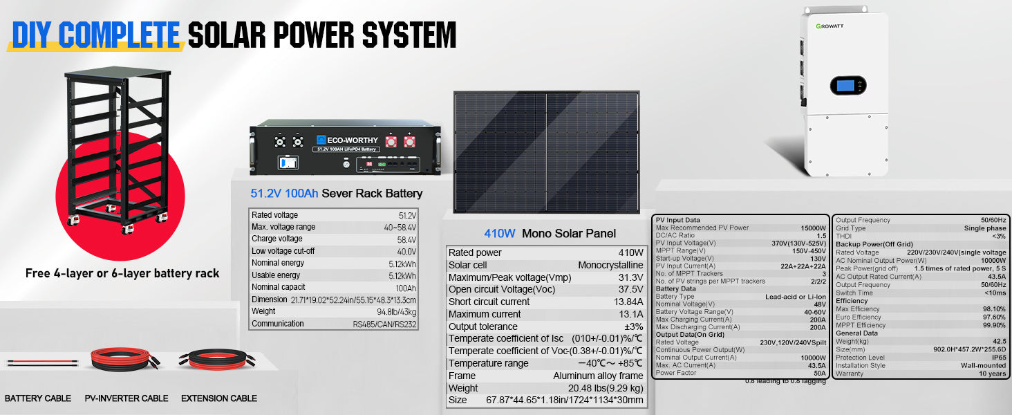 ECO-WORTHY Home Hybrid Solar Power System: 10KW GROWATT 120V/240V Output+ 20.48kWh Lithium Battery (4*48v 100Ah)+ 4920W Solar Panel (12*410W)