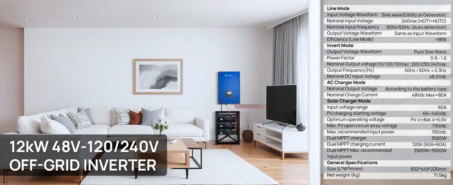 [Efficient and Powerful solar power inverter] Rater output 12KW and 24KW peak power,support single-phase and split-phase output in one device. Customizable AC input time to save every penny of your electricity bill.