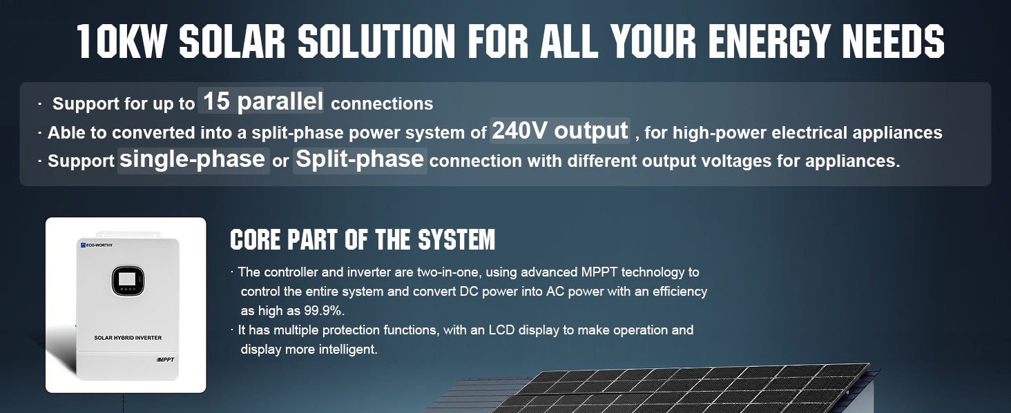 [Efficient and Powerful Solar Hybrid Inverter] Rater output 10KW and 20KW peak power,support single-phase and split-phase output in one device. Customizable AC input time to save every penny of your electricity bill.