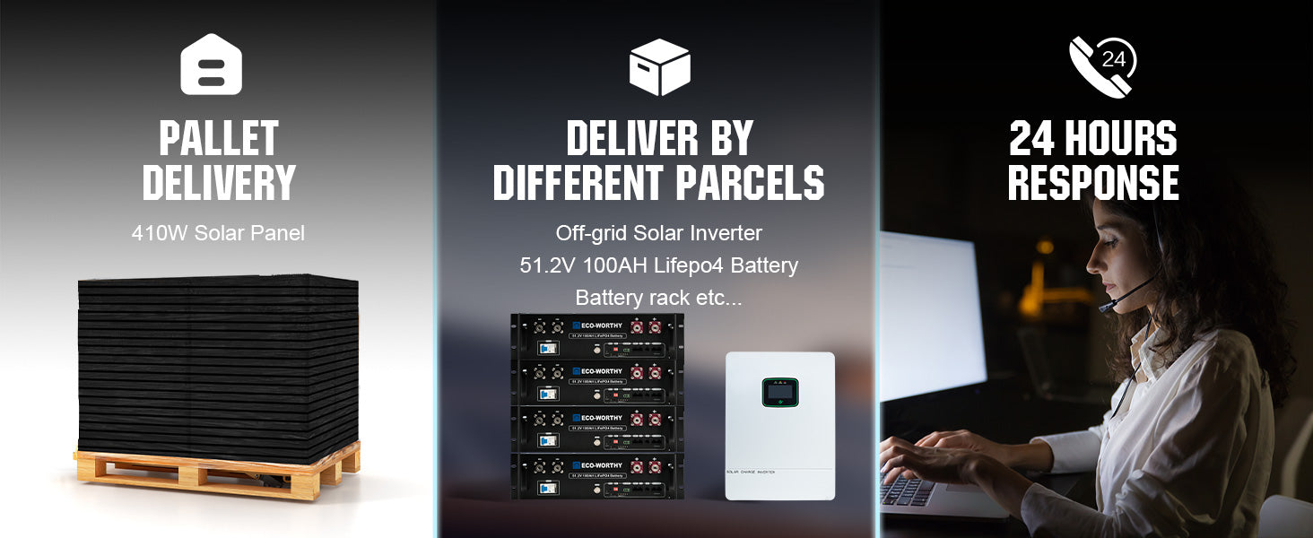 A4:Due to the large number of products included in your system, your order will be shipped in multiple packages. Your solar panels will be palletised and shipped by truck to your mansion. Shipping time is approximately 5-15 days; other products will be delivered by courier.