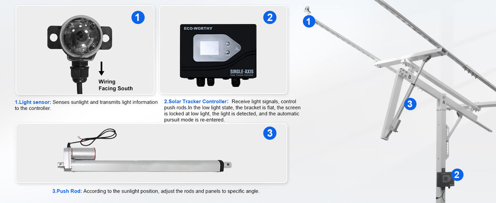 [Easy to use] The setup is very easy, you only need to operate the controller to complete the control of the single axis tracking bracket system.SET Button-Automatically track the solar mode ,FLAT(M)Button-Automatic flat bracket mode.