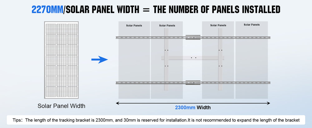 [For different panels] The single-axis tracking racking system is also suitable for different sizes of solar panels.Up to 4 panels can be installed when width of each is less than 22in.Up to 3 panels can be installed when width of each is less than 29.5in.Up to 2 panels can be installed when width of each is less than 44.8in.You can install the board according to the actual needs.