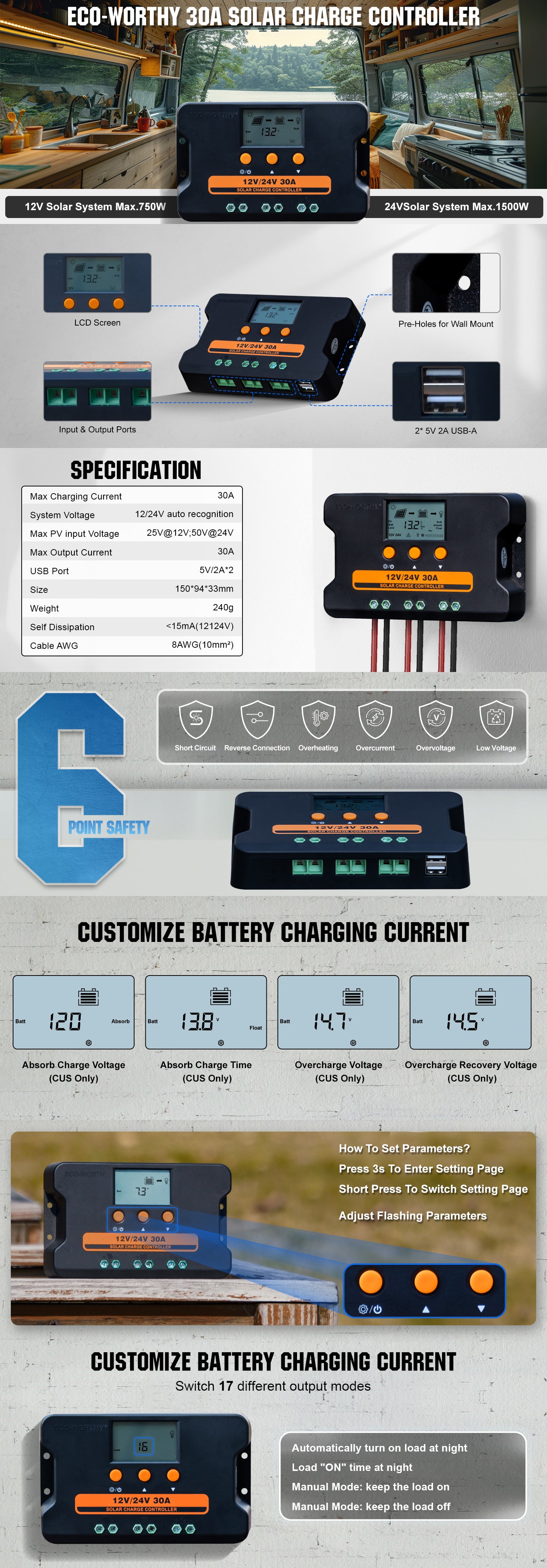 ·Compatible with All Batteries: Compatible with all 12V&24V batteries, supports custom battery parameters (CUS mode), and allows easy selection of preset battery types: LFP, FLD, SLD, GEL.