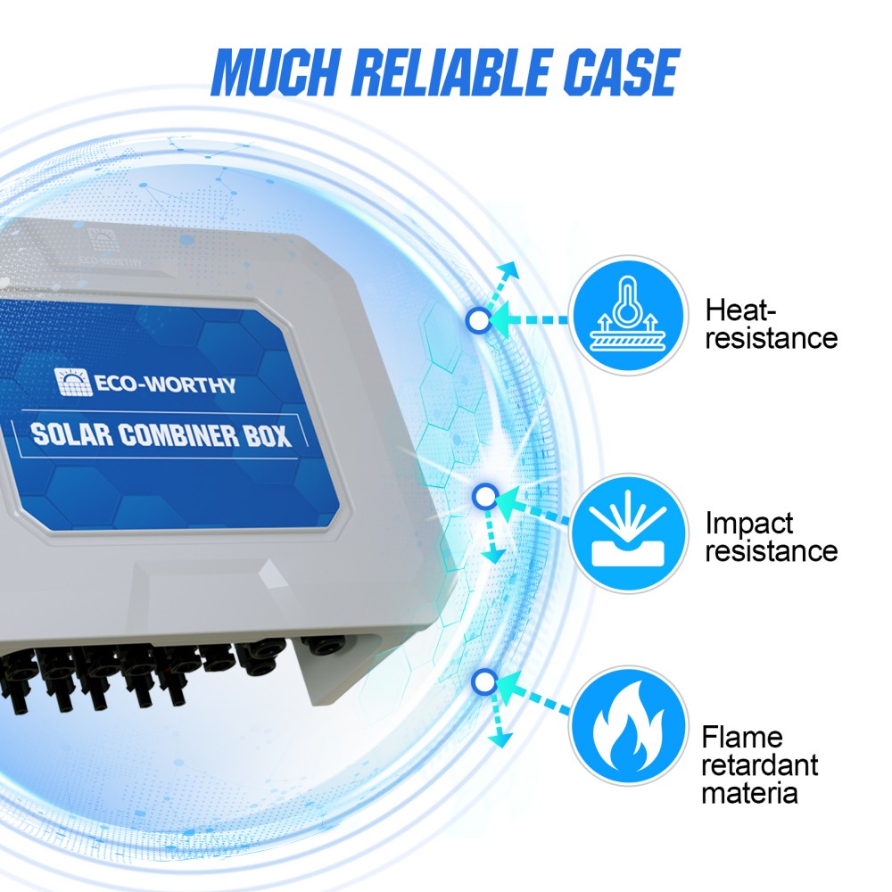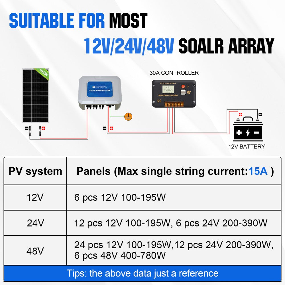 ·High Quality Configuration: Equipped with photovoltaic special 9AWG cable, Maximum 15A single array input, 25A fuse, 125A circuit breaker, more tolerable for high combined current, high voltage resistance, and providing short circuit fault protection and overvoltage and overcurrent protection.